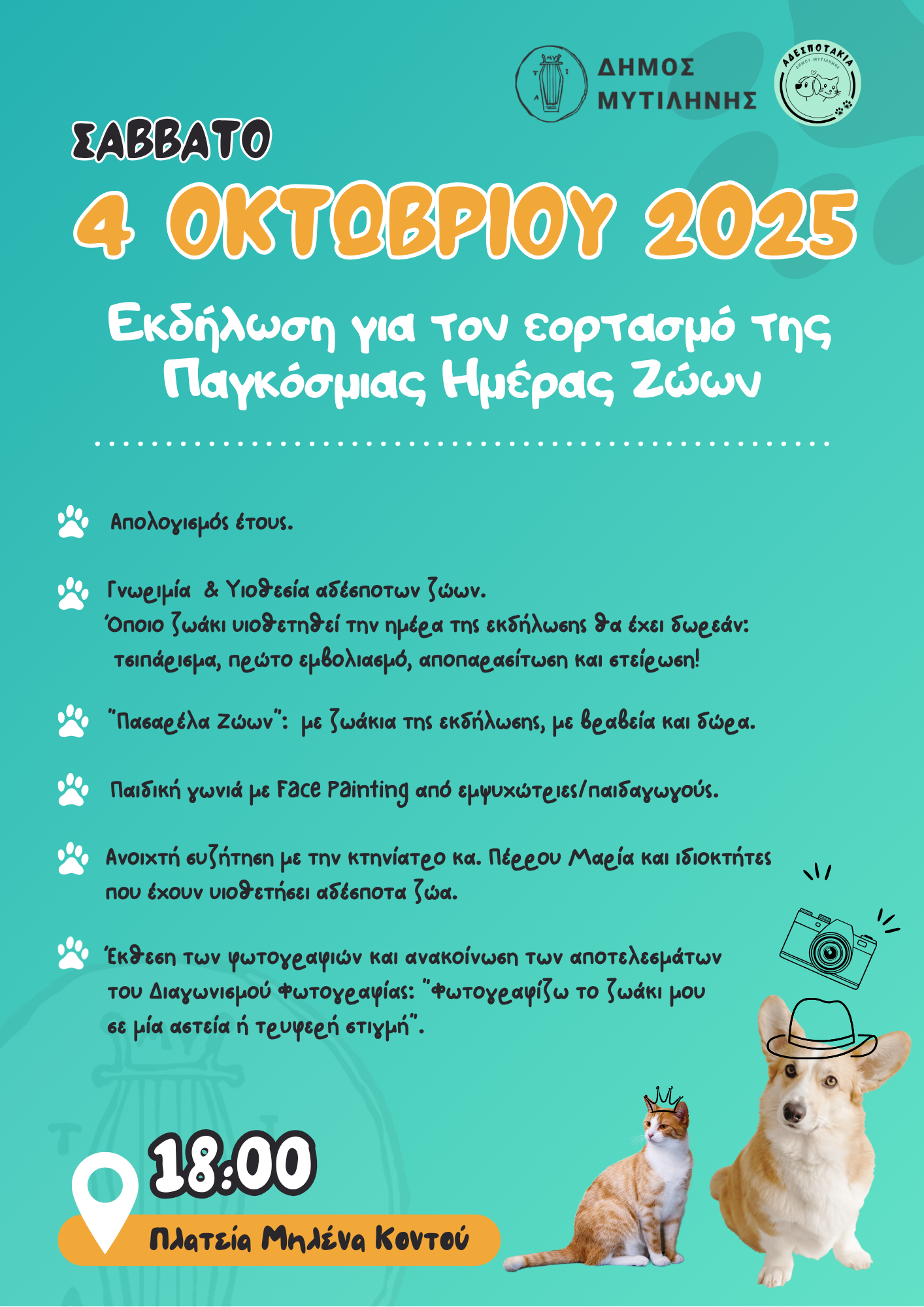 Εκδήλωση για τον εορτασμό της Παγκόσμιας Ημέρας Ζώων διοργανώνει ο Δήμος Μυτιλήνης το Σάββατο 4 Οκτωβρίου στις 18:00 το απόγευμα στην Πλατεία Μηλένα Κοντού, με πολλές δράσεις που θα έχουν ως πρωταγωνιστές τους τετράποδους φίλους μας.