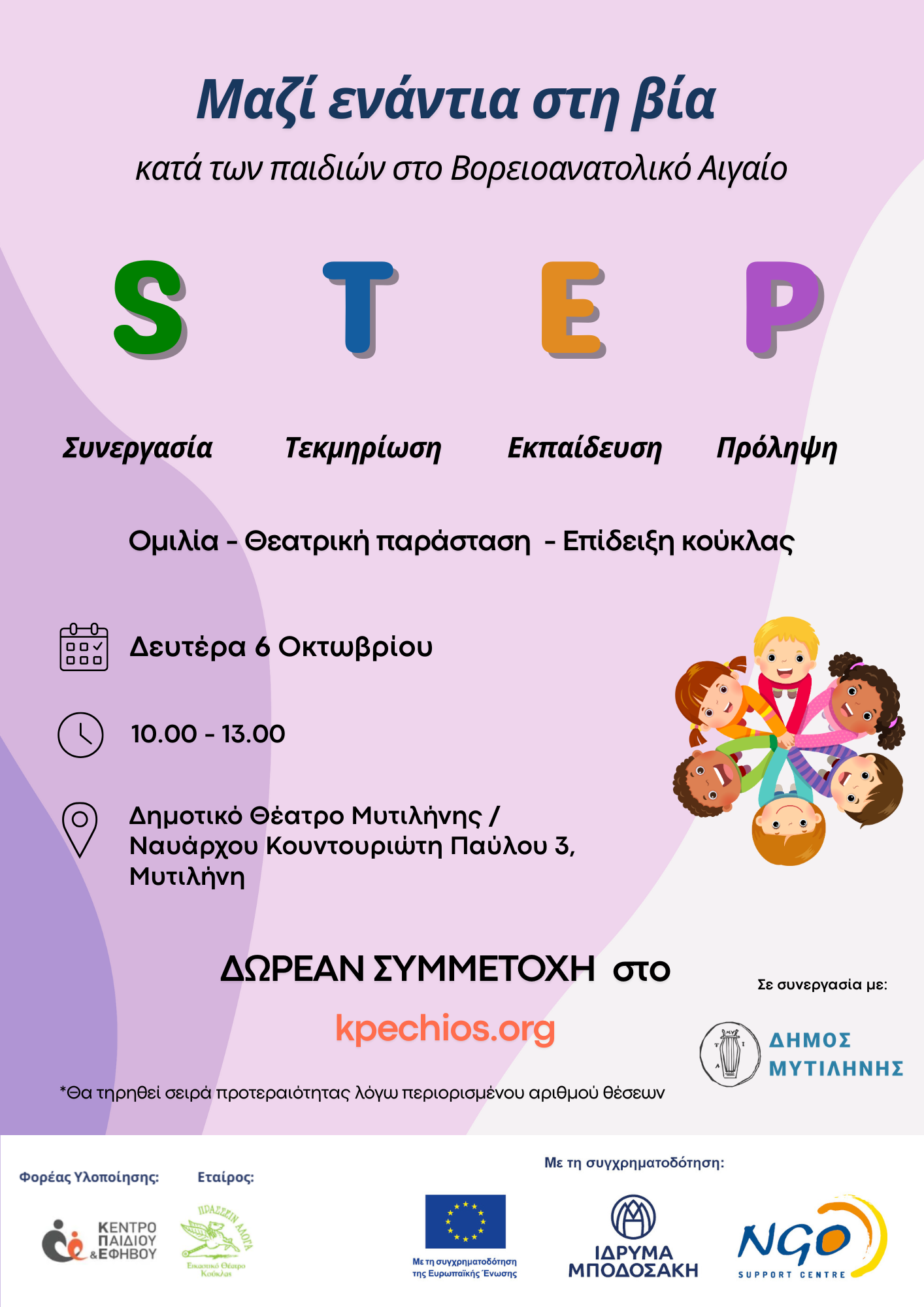 Το έργο «Μαζί ενάντια στη βία κατά των παιδιών στο Βορειοανατολικό Αιγαίο – STEP» έρχεται στη Λέσβο για μια εκδήλωση ενημέρωσης και ευαισθητοποίησης με στόχο την πρόληψη και καταπολέμηση της βίας κατά των παιδιών την Δευτέρα 6 Οκτωβρίου στις 10:00 πμ στο Δημοτικό Θέατρο Μυτιλήνης με τη συνεργασία του Δήμου.