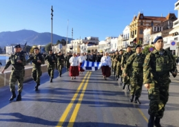 12.00: Κοινή παρέλαση Αναπήρων και Θυμάτων Πολέμου, Αγωνιστών της Εθνικής Αντίστασης, αντιπροσωπειών τοπικών Πολιτιστικών Συλλόγων, των μαθητών και μαθητριών των σχολείων της Πρωτοβάθμιας και Δευτεροβάθμιας Εκπαίδευσης και των Επαγγελματικών Σχολών, Εθελοντικών Οργανώσεων, Οδηγών και Προσκόπων μετά τμημάτων των Ενόπλων Δυνάμεων, διάρκειας 40-60 λεπτών με τη συμμετοχή της Στρατιωτικής Μουσικής.