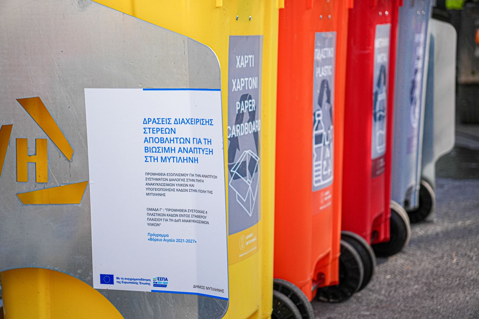 Το σύστημα ανακύκλωσης που δημιουργείται στις σχολικές μονάδες, με χρηματοδότηση από το Πρόγραμμα «Βόρειο Αιγαίο 2021-2027» της Περιφέρειας Βορείου Αιγαίου, περιλαμβάνει ειδικές συστοιχίες κάδων και κάθε συστοιχία αποτελείται από τέσσερις κάδους με σαφή χρωματική σήμανση, ώστε τα παιδιά να ξεχωρίζουν το είδος του υλικού που θα τοποθετούν σε κάθε κάδο. Ο πορτοκαλί κάδος αφορά στην ανακύκλωση των πλαστικών, ο κόκκινος στο μέταλλο, ο κίτρινος το χαρτί και ο γκρι κάδος προορίζεται για τα βρώσιμα έλαια. Στους εσωτερικούς χώρους των σχολείων θα τοποθετηθούν επιπλέον κάδοι για την ανακύκλωση χαρτιού.