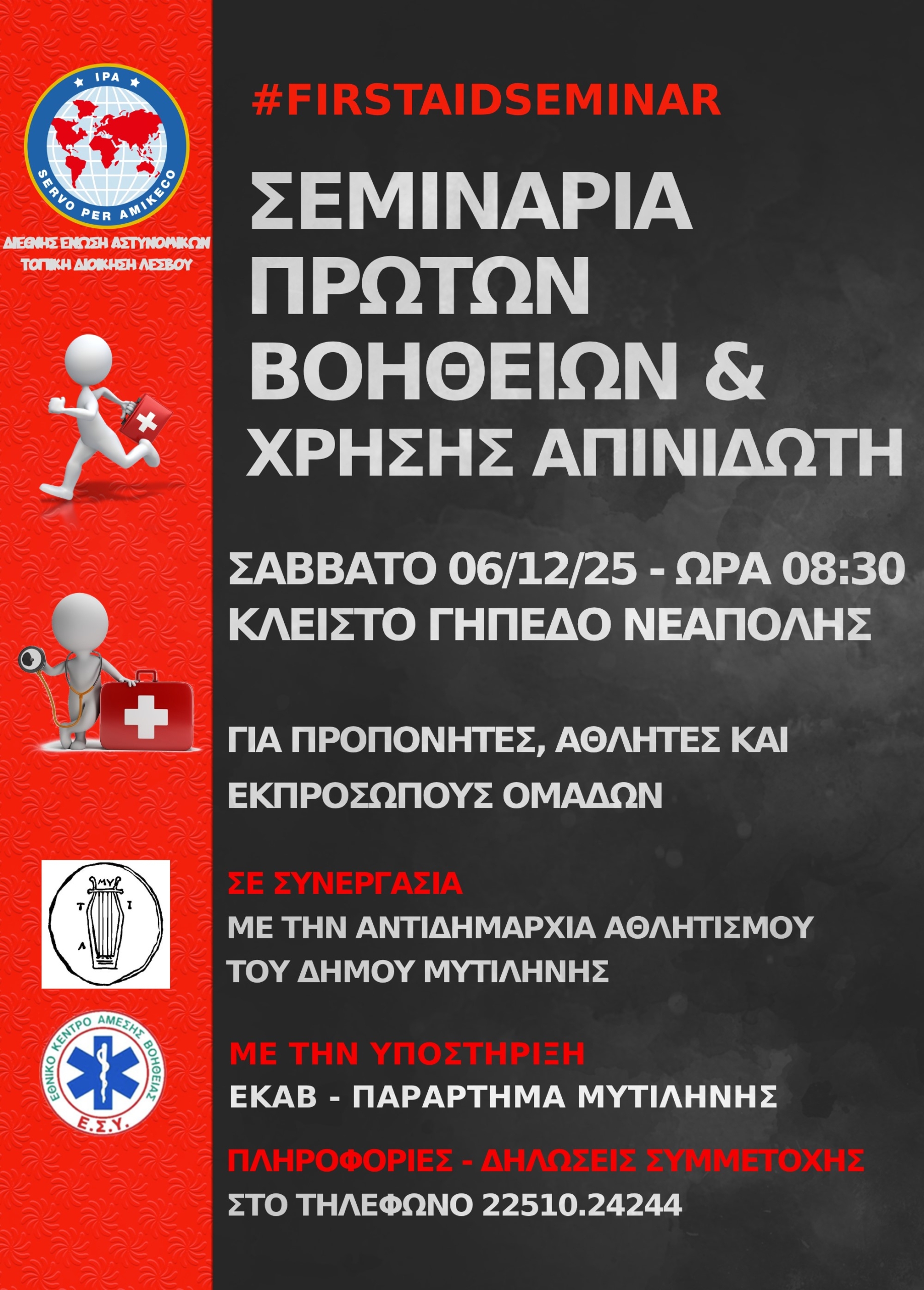 Δωρεάν σεμινάρια πρώτων βοηθειών και χρήσης απινιδωτή διοργανώσει το Σάββατο, 6 Δεκεμβρίου, στο Κλειστό Γυμναστήριο της Νεάπολης, η Τοπική Διοίκηση Λέσβου της Διεθνούς Ένωσης Αστυνομικών σε συνεργασία με την Αντιδημαρχία Αθλητισμού του Δήμου Μυτιλήνης και με την υποστήριξη του Παραρτήματος Μυτιλήνης του ΕΚΑΒ.