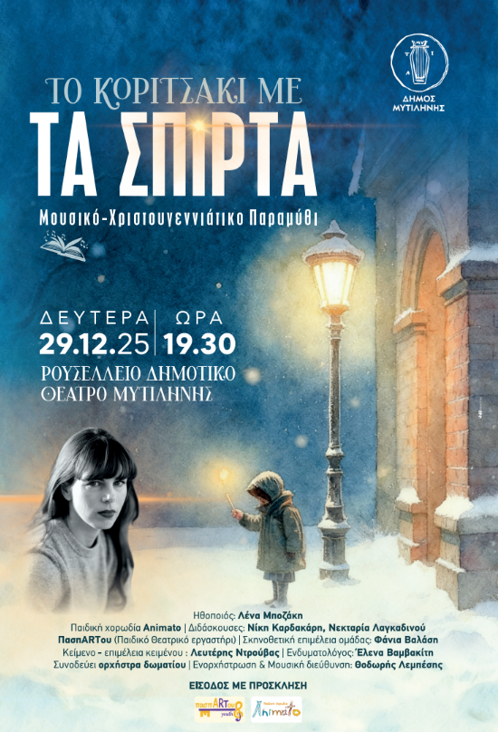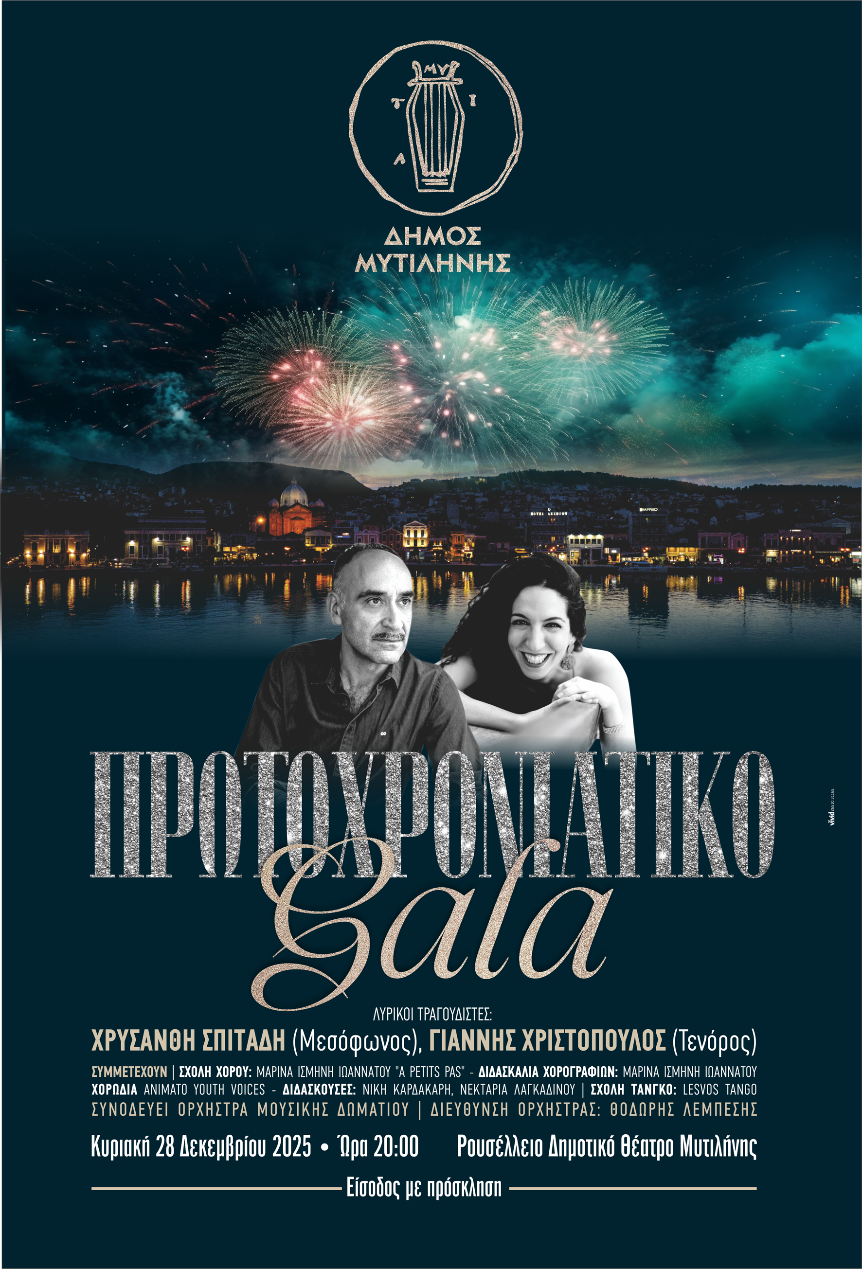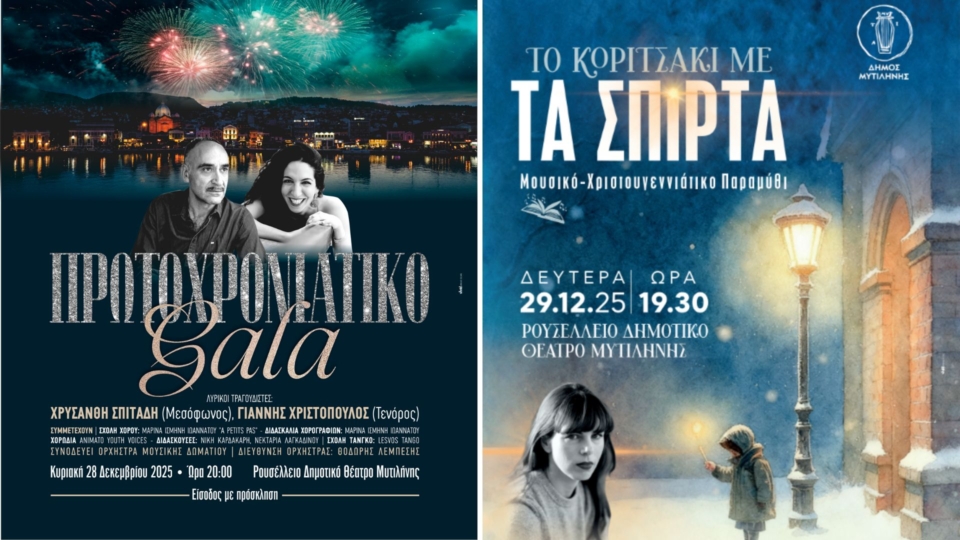 Δωρεάν προσκλήσεις θα διαθέσει ο Δήμος Μυτιλήνης στο κοινό για τις δύο μεγάλες εορταστικές εκδηλώσεις του στο Δημοτικό Θέατρο, το Πρωτοχρονιάτικο Gala την Κυριακή 28 Δεκεμβρίου στις 20:00 και την παράσταση «Το Κοριτσάκι με τα Σπίρτα»  την Δευτέρα 29 Δεκεμβρίου στις 19:30. Οι προσκλήσεις θα διατίθενται από το ταμείο του Δημοτικού Θεάτρου την Δευτέρα 22 Δεκεμβρίου κατά τις ώρες 12:00 – 14:00 και έως τη εξάντλησή τους.