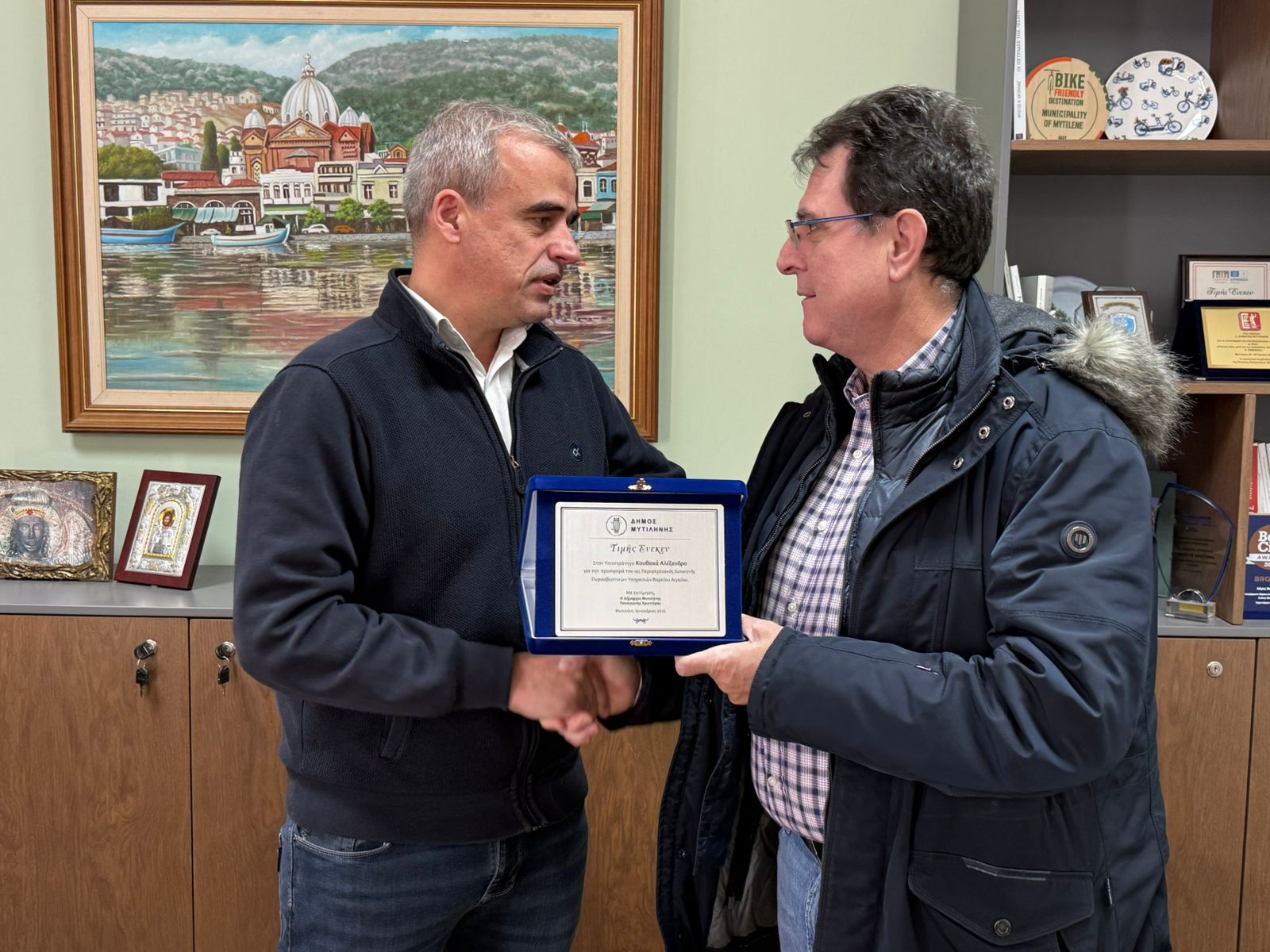 Ο κ. Χριστόφας ευχαρίστησε θερμά τα στελέχη της Πυροσβεστικής Υπηρεσίας για την αγαστή συνεργασία με τον Δήμο Μυτιλήνης και την προσφορά τους στον τόπο μας, ενώ τους απένειμε τιμητικές πλακέτες.