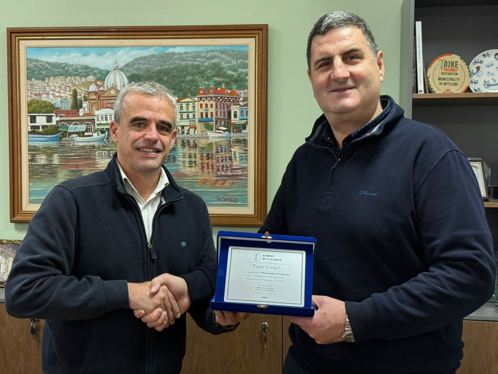 Επίσκεψη στο Δήμαρχο Μυτιλήνης, Παναγιώτη Χριστόφα, πραγματοποίησαν το πρωί της Τρίτης ο μέχρι πρότινος Περιφερειακός Διοικητής Πυροσβεστικών Υπηρεσιών Βορείου Αιγαίου, Αλέξανδρος Κουβακάς, καθώς και ο απερχόμενος Διοικητής των Πυροσβεστικών Υπηρεσιών Νομού Λέσβου, Παναγιώτης Μπιμπούδης, παρουσία του Αντιδημάρχου Πολιτικής Προστασίας, Νίκου Καρασάββα.