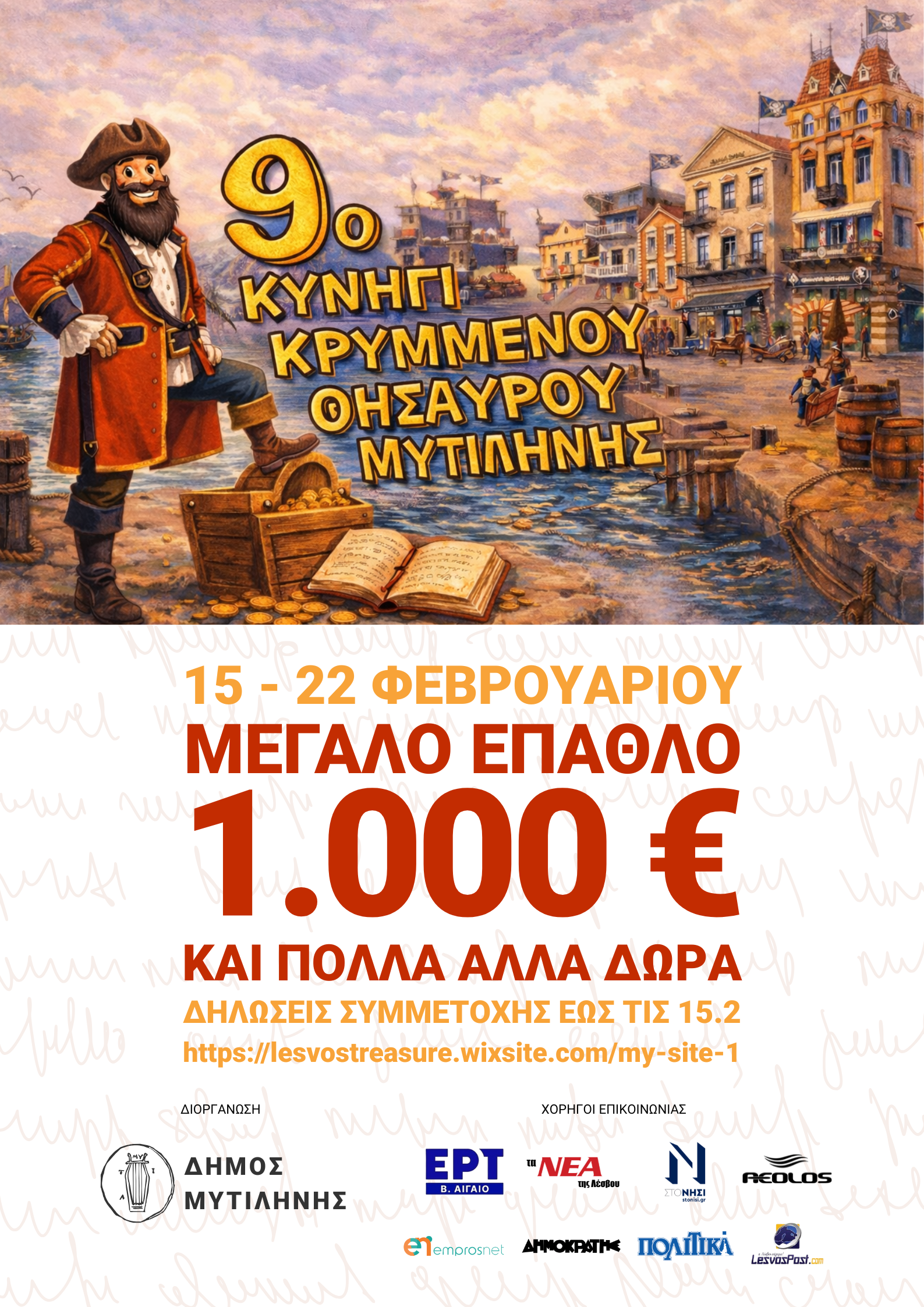 Αντίστροφα μετρά ο χρόνος για να δοθεί το σύνθημα και να ξεκινήσει το «Κυνήγι του Κρυμμένου Θησαυρού» που θα πραγματοποιηθεί για 9η φορά στο πλαίσιο των αποκριάτικων εκδηλώσεων που διοργανώνει ο Δήμος Μυτιλήνης.