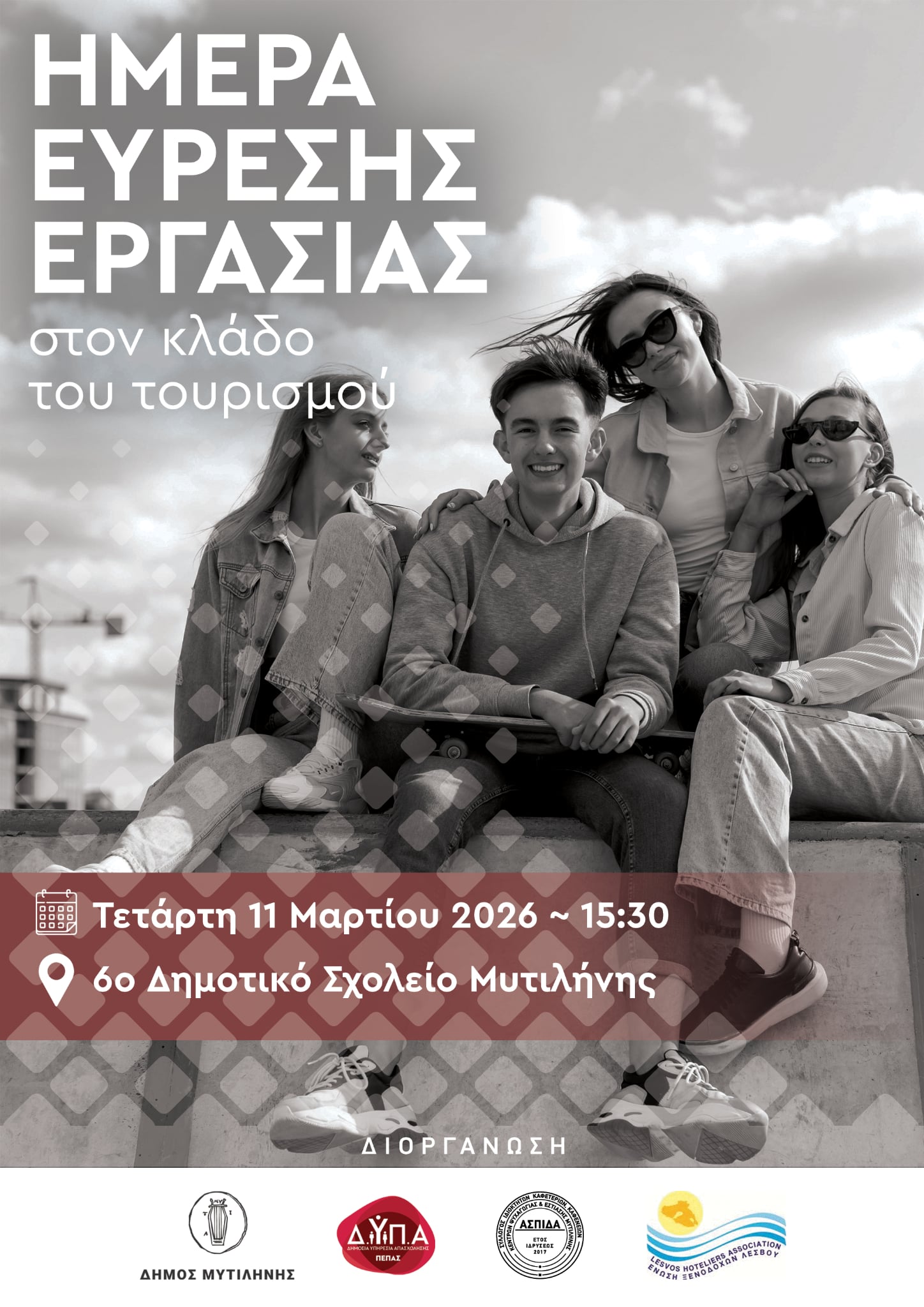 Η 3η Ημέρα Εύρεσης Εργασίας στον κλάδο του τουρισμού, μια σημαντική πρωτοβουλία που φέρνει σε άμεση επαφή επαγγελματίες, εργοδότες και υποψήφιους εργαζόμενους, διοργανώνεται την Τετάρτη, 11 Μαρτίου 2026 από τον Δήμο Μυτιλήνης, την Ένωση Ξενοδόχων Λέσβου, τον Σύλλογο Καταστημάτων Εστίασης και Ψυχαγωγίας «Ασπίδα» και την Πειραματική Επαγγελματική Σχολή της Δημόσιας Υπηρεσίας Απασχόλησης Ανέργων (Δ.ΥΠ.Α.). Η εκδήλωση θα πραγματοποιηθεί στις 15:30 το μεσημέρι, στο 6ο Δημοτικό Σχολείο Μυτιλήνης (είσοδος από την οδό Ναυμάχου Παπανικολή).