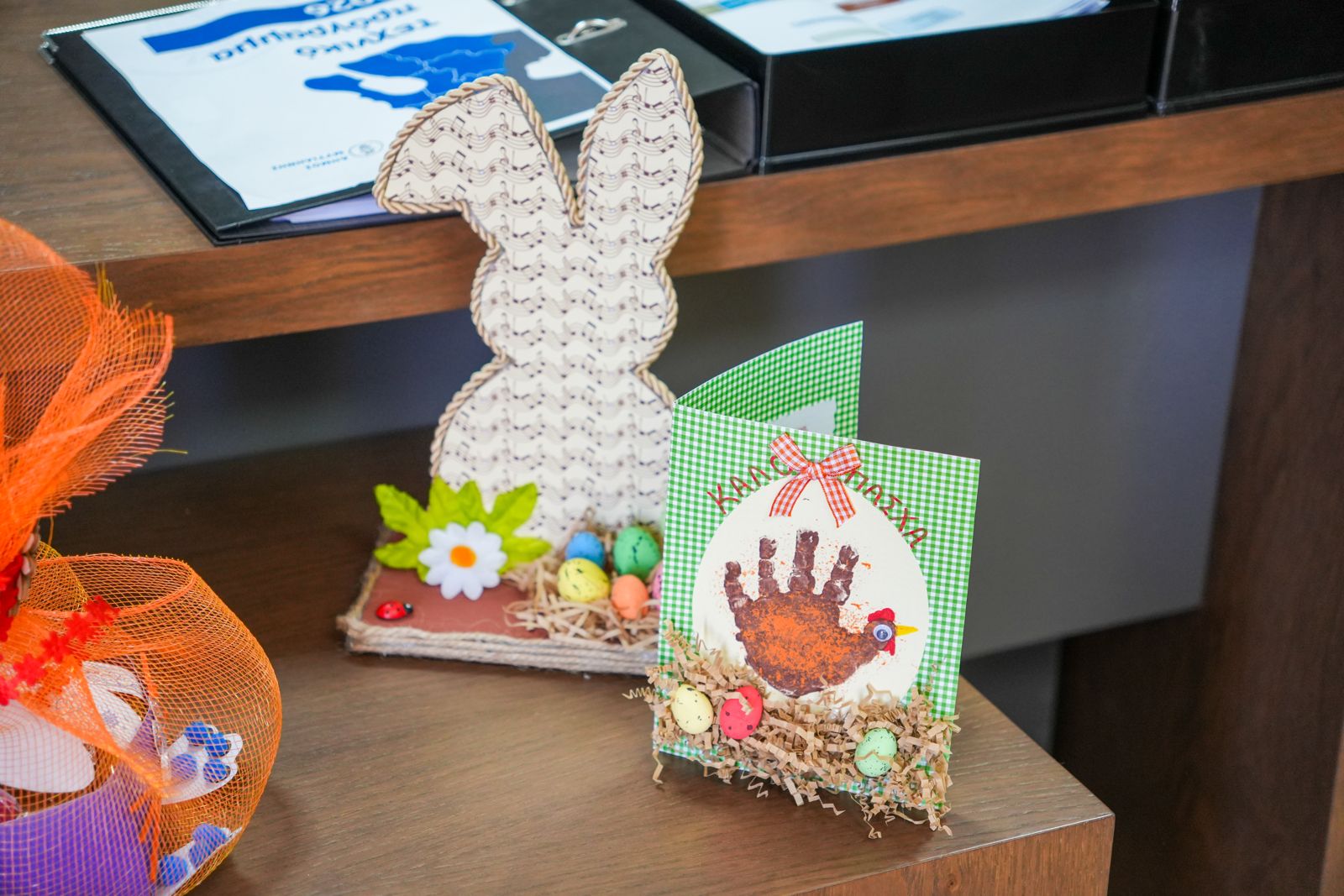 Η Ομάδα Πλεκτικής του Κέντρου χάρισε στον Δήμαρχο χειροποίητα πλεκτά διακοσμητικά δώρα και παραδοσιακά πασχαλινά κουλουράκια, ενώ ο κ. Σπανός μετέφερε επίσης πασχαλινές ευχετήριες κάρτες και κατασκευές παιδιών από τους Παιδικούς Σταθμούς.